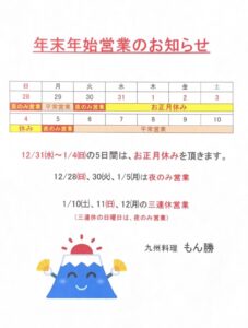 もん勝の来年の営業開始は1月5日(月)のディナーからとなります。